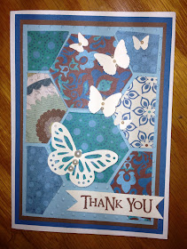 I went back to my roots with a paperpieced, pen stitched teapot card and tea holder. Sorry, I neglected to take a picture inside of the holder but it holds 2 tea bags and some daisy embellishments.The pattern for this card is from papercraft inspirations. I thought I'd use the metals since they have been in my stash like forever! Daisy flower punch, sun punch, rhinestones, free-hand heart, MM metal leaves and MM metal frame. Unknown brand stamp and stickles.
